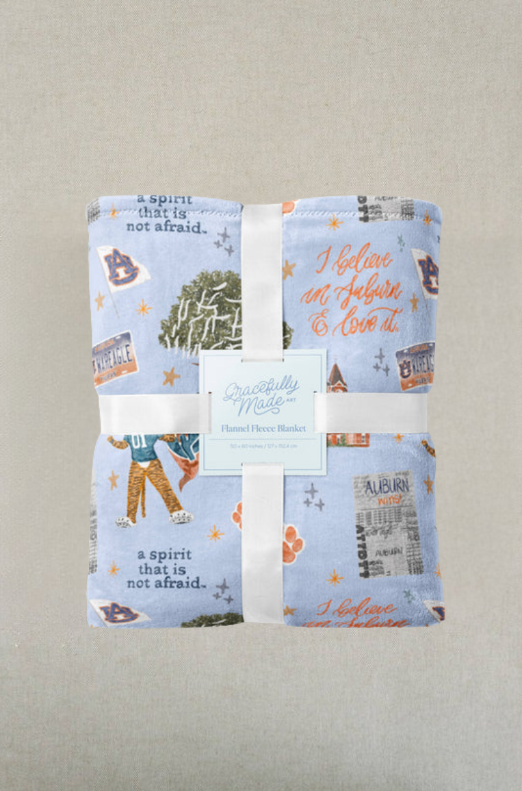 Show your Auburn pride with this cozy flannel fleece blanket! Featuring a hand-illustrated design with iconic Auburn imagery and spirited phrases, it’s perfect for your Auburn Cave or chilly game days.