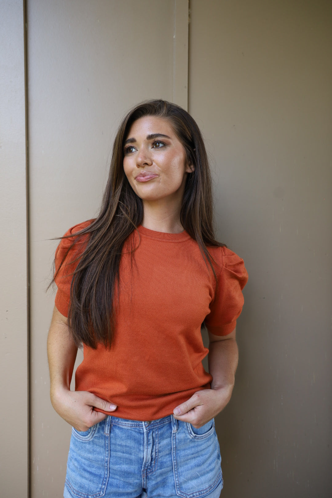 This burnt orange sweater is a go to for effortless style! With puff sleeves, a ribbed hem, and elbow-length sleeves, it’s the perfect blend of polished and casual. It’s easy to dress up for work or throw on for weekend plans!