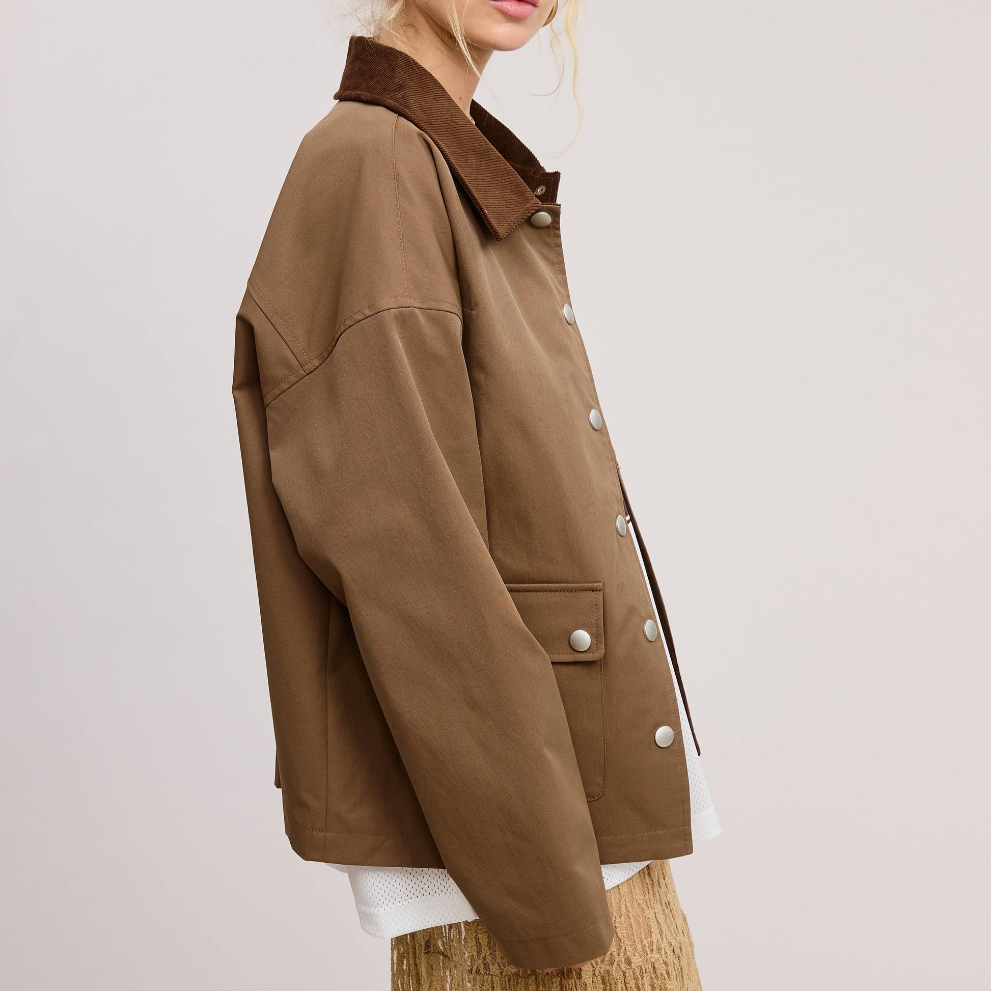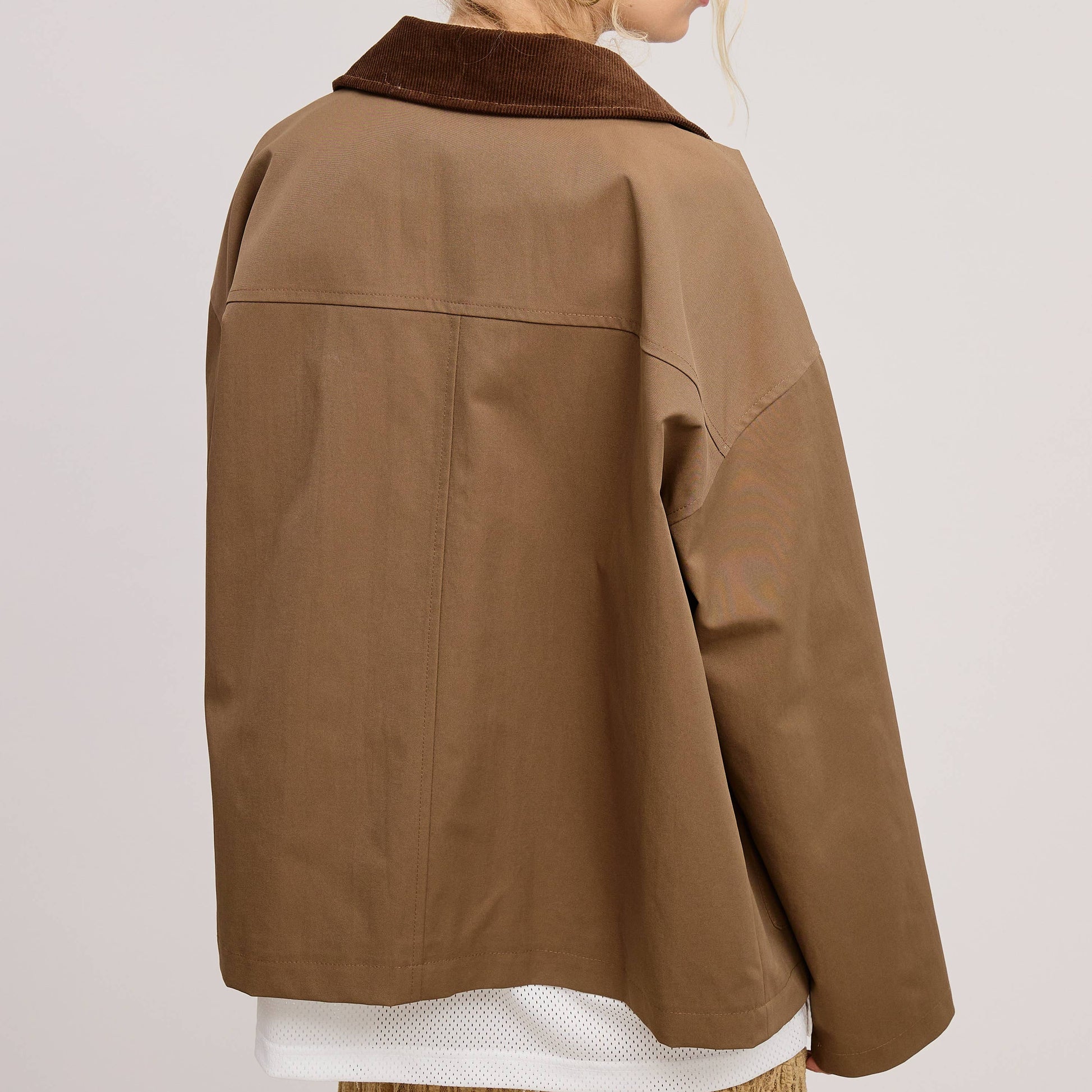 With its corduroy collar, front snap closure, and front pockets, this oversized barn jacket is the perfect addition to your fall wardrobe!